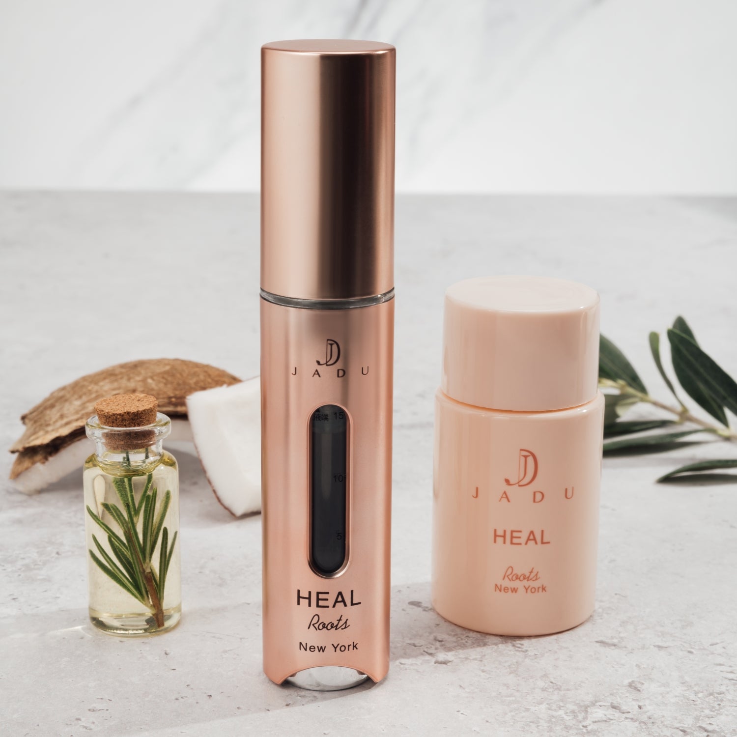 HEAL is elegantly packaged in a luxurious magnetic open-top box, featuring a 15 mL Magic Comb applicator and a 60 mL refill bottle. The innovative Magic Comb, designed with 5 active and 4 passive nozzles, allows for precise, mess-free application directly to the roots. Thoughtfully designed inserts secure each component, ensuring both ease of use and a premium presentation. The refillable system reflects Jadu’s commitment to sustainability, functionality, and luxury.