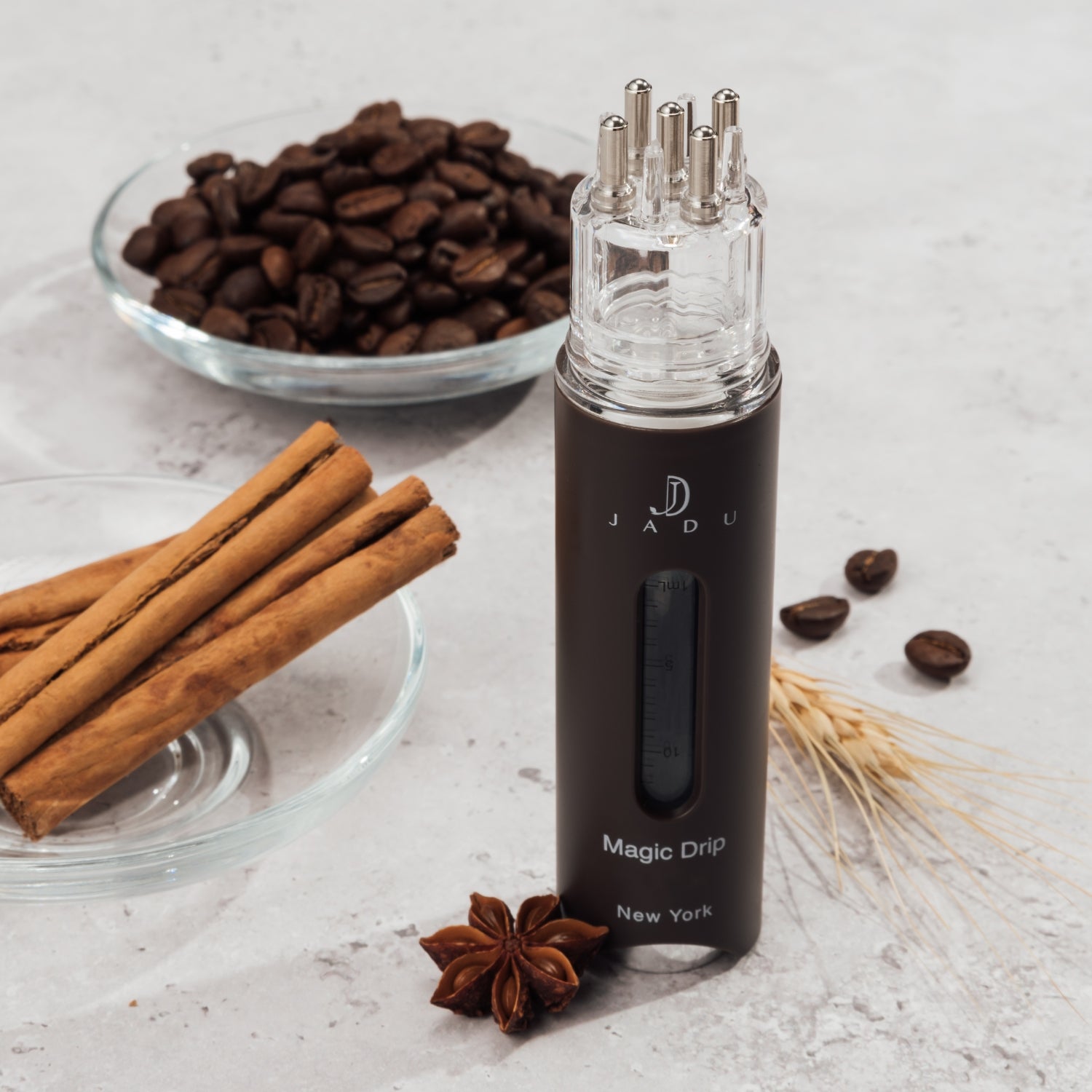 Jadu Magic Drip comes in a luxurious magnetic open-top box that includes a 15 mL applicator, a 60 mL refill, and a precision funnel for mess-free refilling. The packaging is designed to highlight the premium nature of the product and includes a sustainable, refillable system.